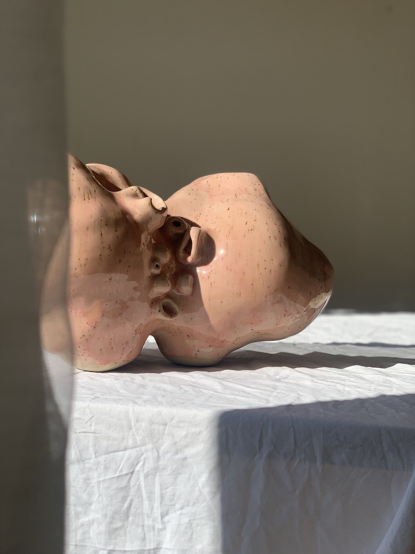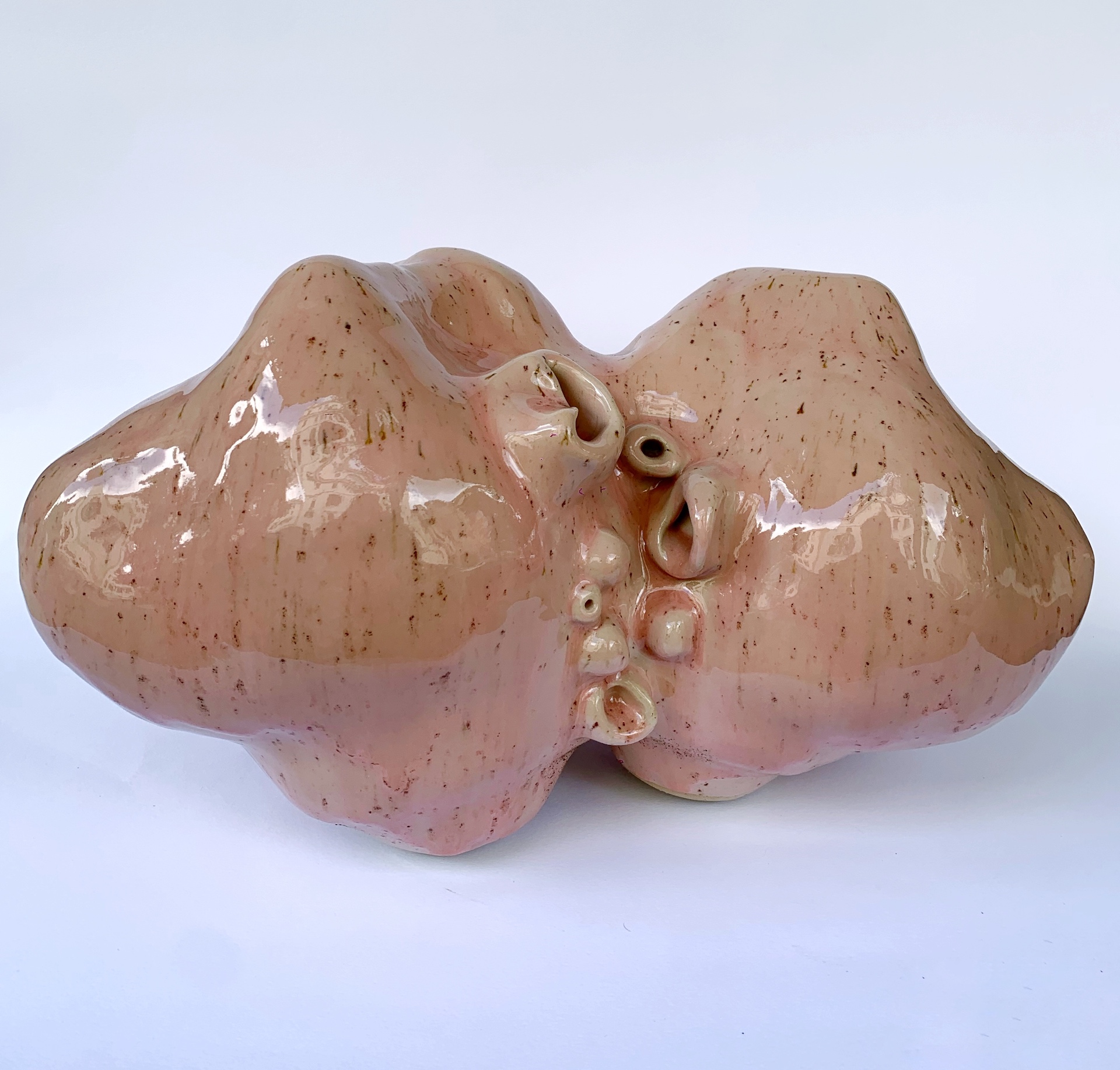 Il lavoro di Gina Babić racconta, attraverso il medium della ceramica, le tensioni tra corpo, identità e memoria. Le sue opere, caratterizzate da forme irregolari e superfici segnate da bozzi e nodosità, trasformano l’argilla in un archivio di traumi e riflessioni esistenziali. Privilegiando come meccanismo narrativo la deformazione – intesa come evasione dalla forma e dalla regola – spinge le potenzialità della materia oltre i suoi limiti tradizionali, esaltandone il carattere instabile e fluido. La ceramica, solida e densa, diventa un velo sottile attraverso cui trasparisce la sofferenza del corpo-scultura, che giunge all’estrema deformazione in risposta all’esigenza di contenere ciò che altrimenti straborderebbe.