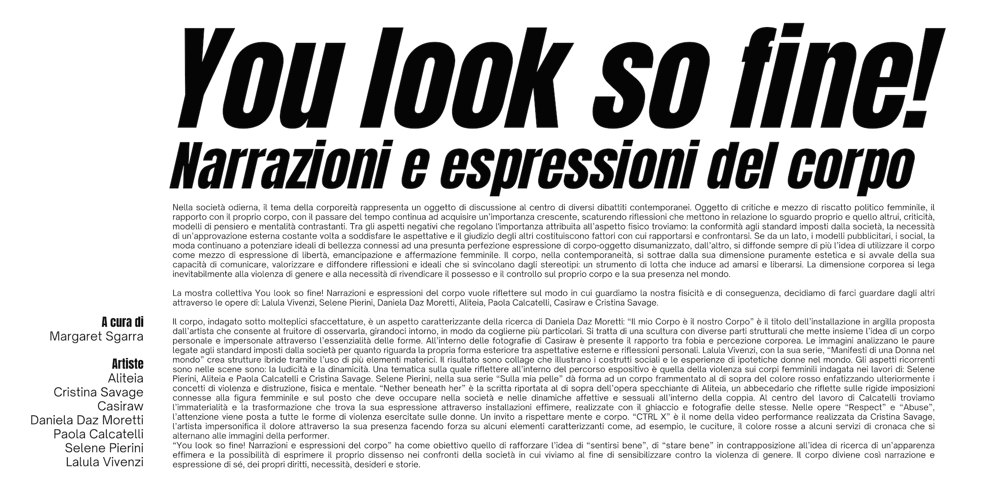 La mostra collettiva “You look so fine! Narrazioni e espressioni del corpo” vuole riflettere sul modo in cui guardiamo la nostra fisicità e di conseguenza, decidiamo di farci guardare dagli altri attraverso le opere di: Lalula Vivenzi, Selene Pierini, Daniela Daz Moretti, Aliteia, Paola Calcatelli, Casiraw e Cristina Savage.