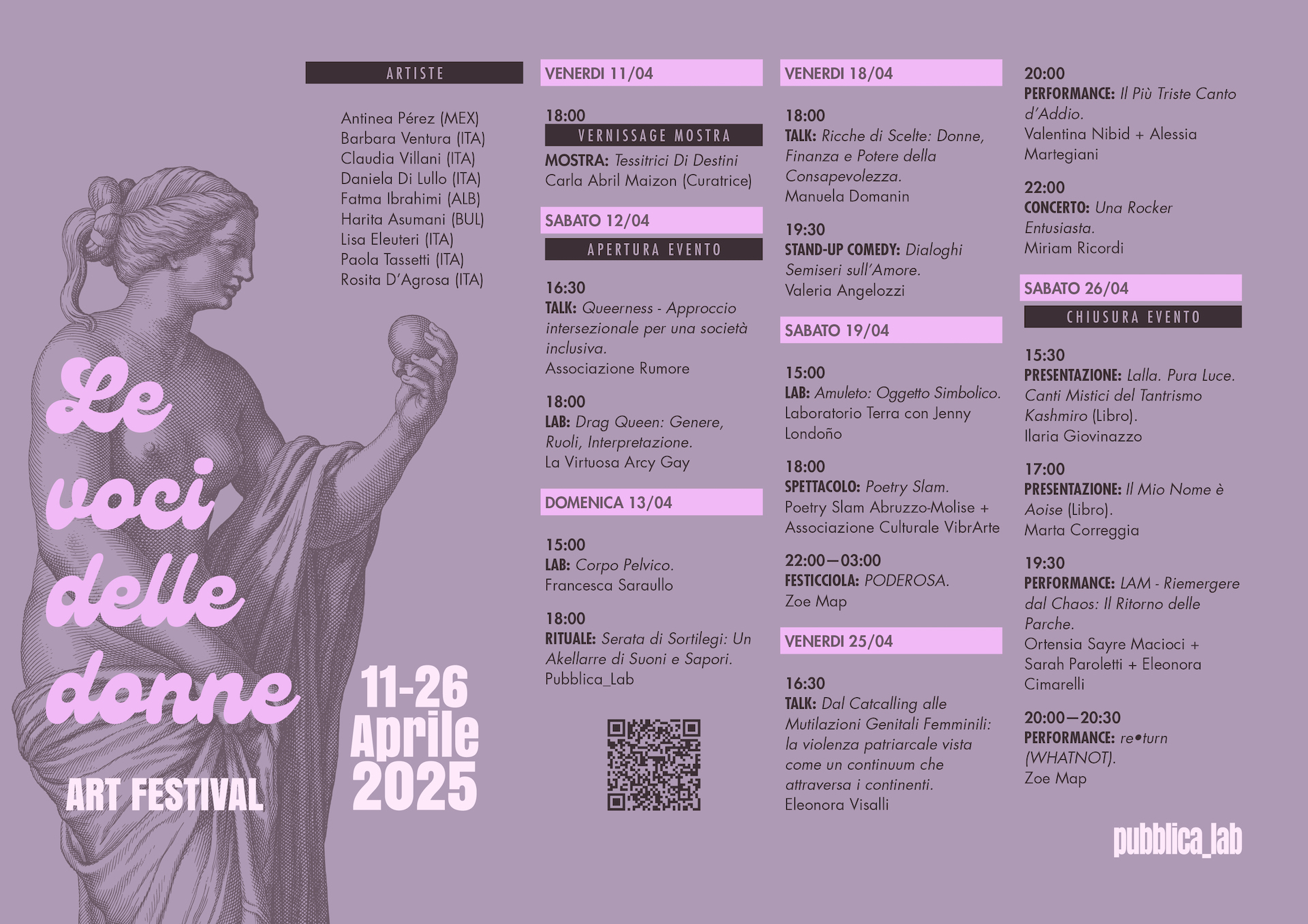 Siamo felici di aver ospitato la seconda edizione del Festival Le Voci delle Donne, un evento che ha celebrato la creatività femminile attraverso l’arte, la cultura e la condivisione di esperienze. Quest’anno, il festival si è svolto dall’11 al 26 aprile 2025 presso Pubblica_Lab a Sant’Omero (TE).