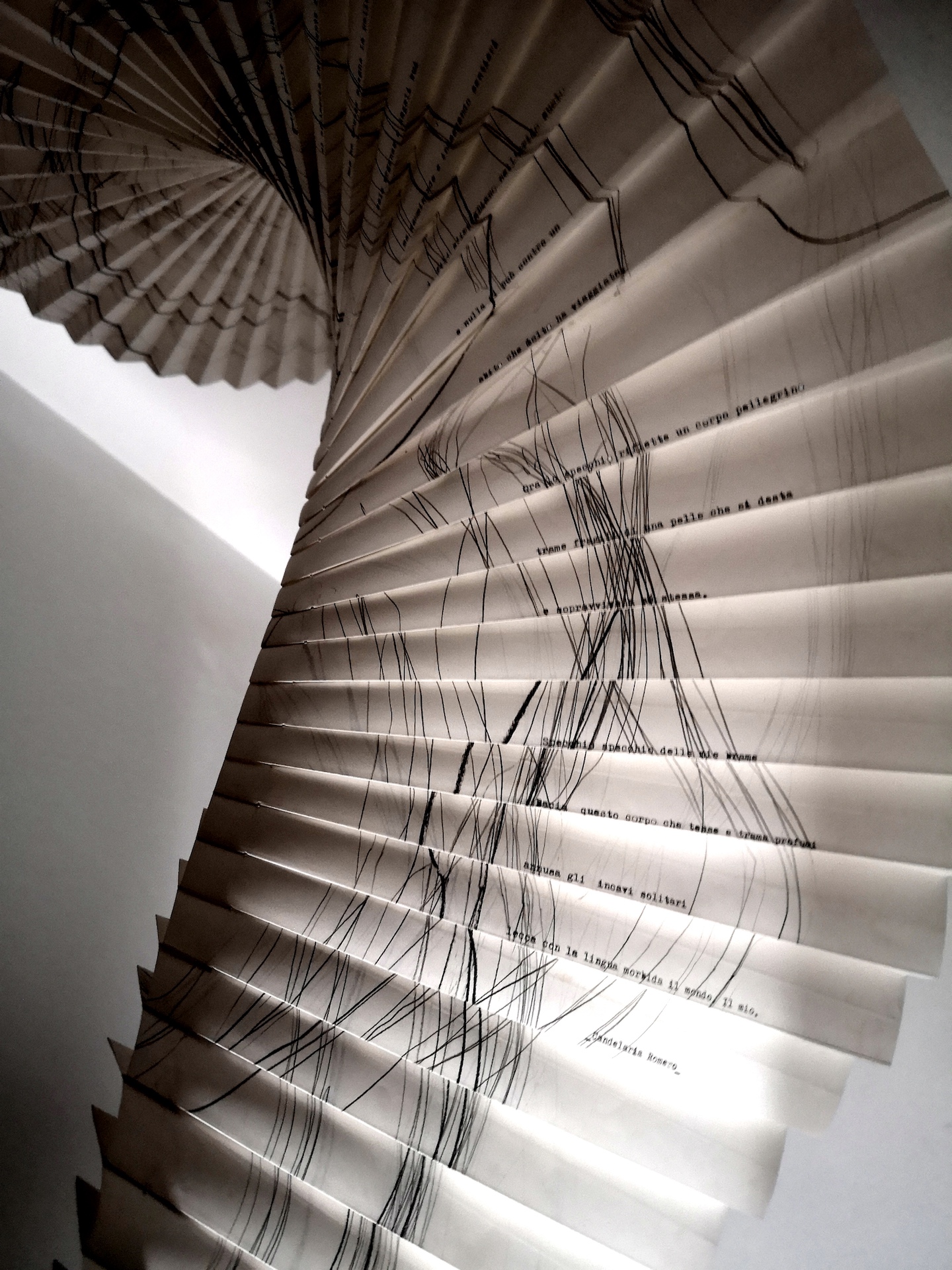 Pronuncio ancora la parola artista a bassa voce, anche e non solo, perché ho scoperto tardi questa radice nascosta: ho scoperto per questioni di mestiere che mi riusciva bene piegare la carta. E non ho più smesso di farlo. Ma la semplice fascinazione tecnica e geometrica si sarebbe esaurita in tempi rapidi se non avessi trasformato le mie effimere creature in portatrici di racconti e complessità. Spesso lavoro sola, ma mentre racconto del corpo, del sentire anche fisico come essere umano e donna, cerco di tenere il mio sottotraccia, inseguendo piuttosto un riflesso nello specchio universale. Poi esiste in un percorso parallelo la richiesta di partecipazione, la ricerca di un fare comune, la possibilità di creare insieme. Da qui le opere collettive e laboratoriali, attraverso le quali cerco di “fare la mia parte”. La carta ha poco peso, ingiallisce, si strappa, brucia, si scioglie, si consuma,… Ma nella sua estrema fragilità e leggerezza può essere forte se piegata nel modo giusto. Sulla carta da sempre si appoggiano gesti e pensieri. Traspare la luce.