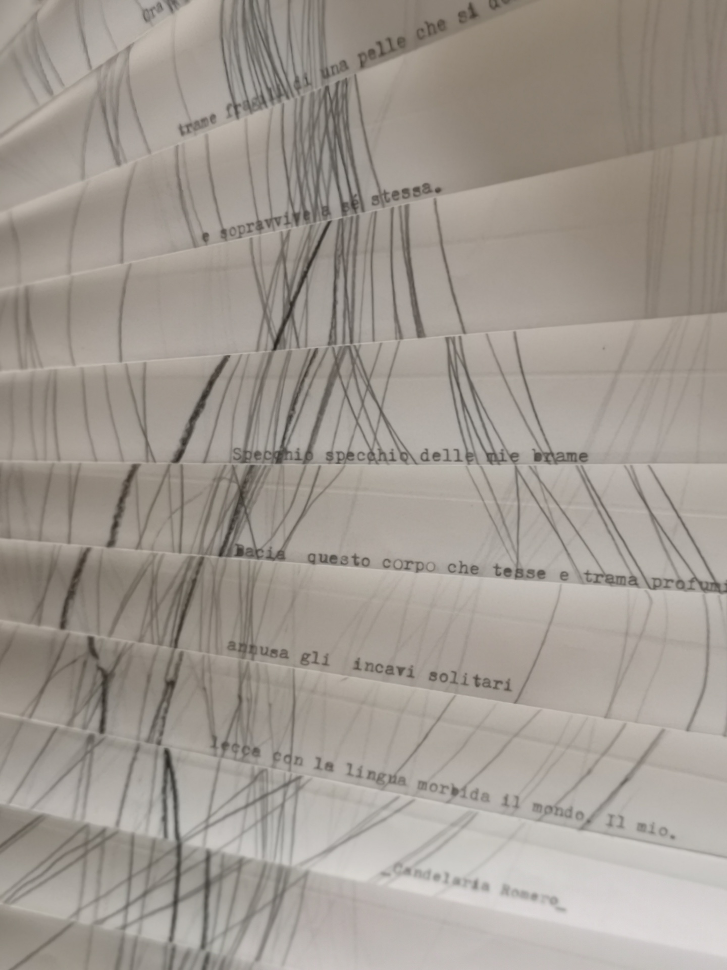 “Questa pelle è fatta di fili di seta e d’oro si sfilaccia facilmente se usata con noncuranza. Non ha brutte pieghe la pelle solo urgenze e angoli bui ma camminando e indossando sentieri i fili s’impigliano nell’arido suolo e nulla si può contro un abito che molto ha viaggiato. Ora lo specchio riflette un corpo pellegrino trame fragili di una pelle che si desta e sopravvive a sé stessa. Specchio specchio delle mie brame bacia questo corpo che tesse e trama profumi annusa gli incavi solitari lecca con lingua morbida il mondo. Il mio.”