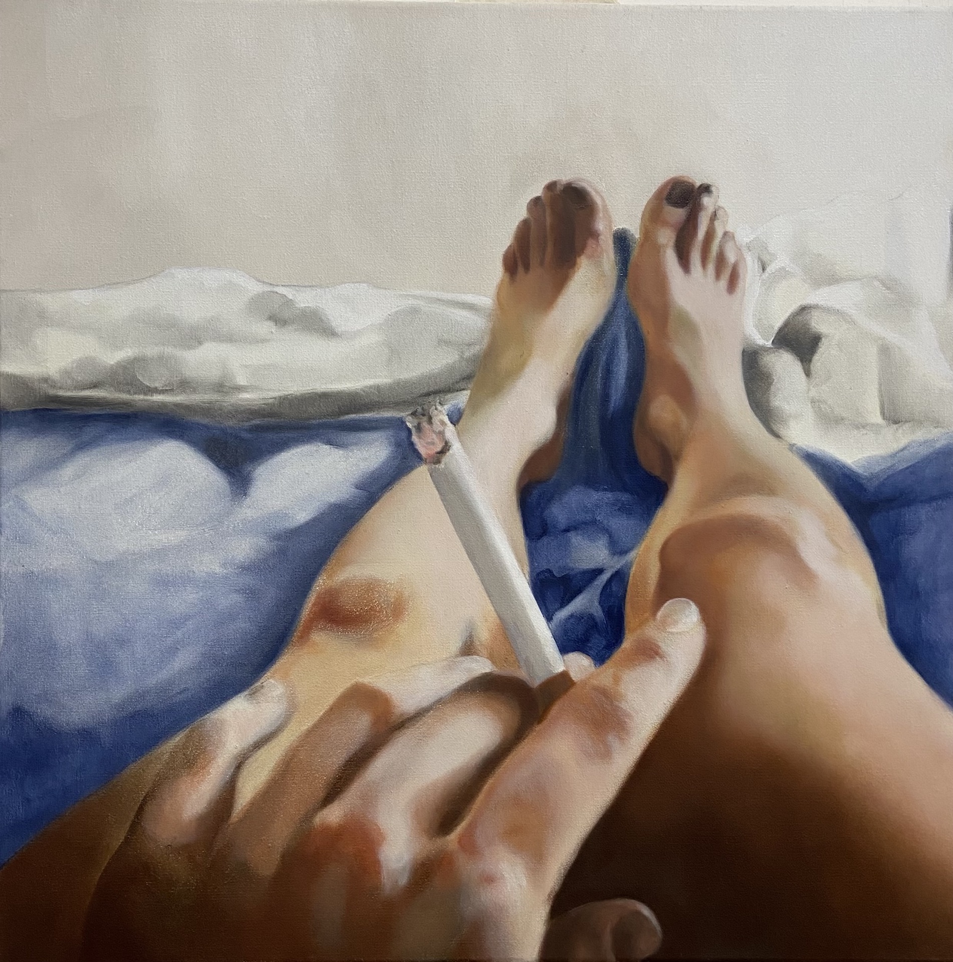 Climax esplora il rapporto tra il desiderio di appartenenza sociale e la tensione verso la dimensione individuale e l’introspezione interiore. Le opere si articolano attraverso un’alternanza di linguaggi pittorici e simbolismi visivi per amplificare il significato emotivo e concettuale del progetto. Figure monocromatiche, ridotte a sagome anonime e dinamiche (il climax emotivo e visivo), rappresentano un’allusione cromatica che enfatizza l’aspirazione a far parte di un insieme sociale, ma anche l’alienazione che ne può derivare. Queste immagini si contrappongono a tele dipinte con maggiore realismo, dettagli intimi del corpo dell’artista, rivelando una dimensione introspettiva. Questi particolari, metafore della propria indolenza, rappresentano uno stato di stasi e introspezione in netto contrasto con la pulsione collettiva evocata dalle altre opere. Climax è un viaggio visivo tra la tensione del sé e dell’altro, tra l’aspirazione alla fusione con il gruppo e il peso della propria individualità. Il gioco di ritmi cromatici e stilistici amplifica l’impatto emotivo dell’opera.