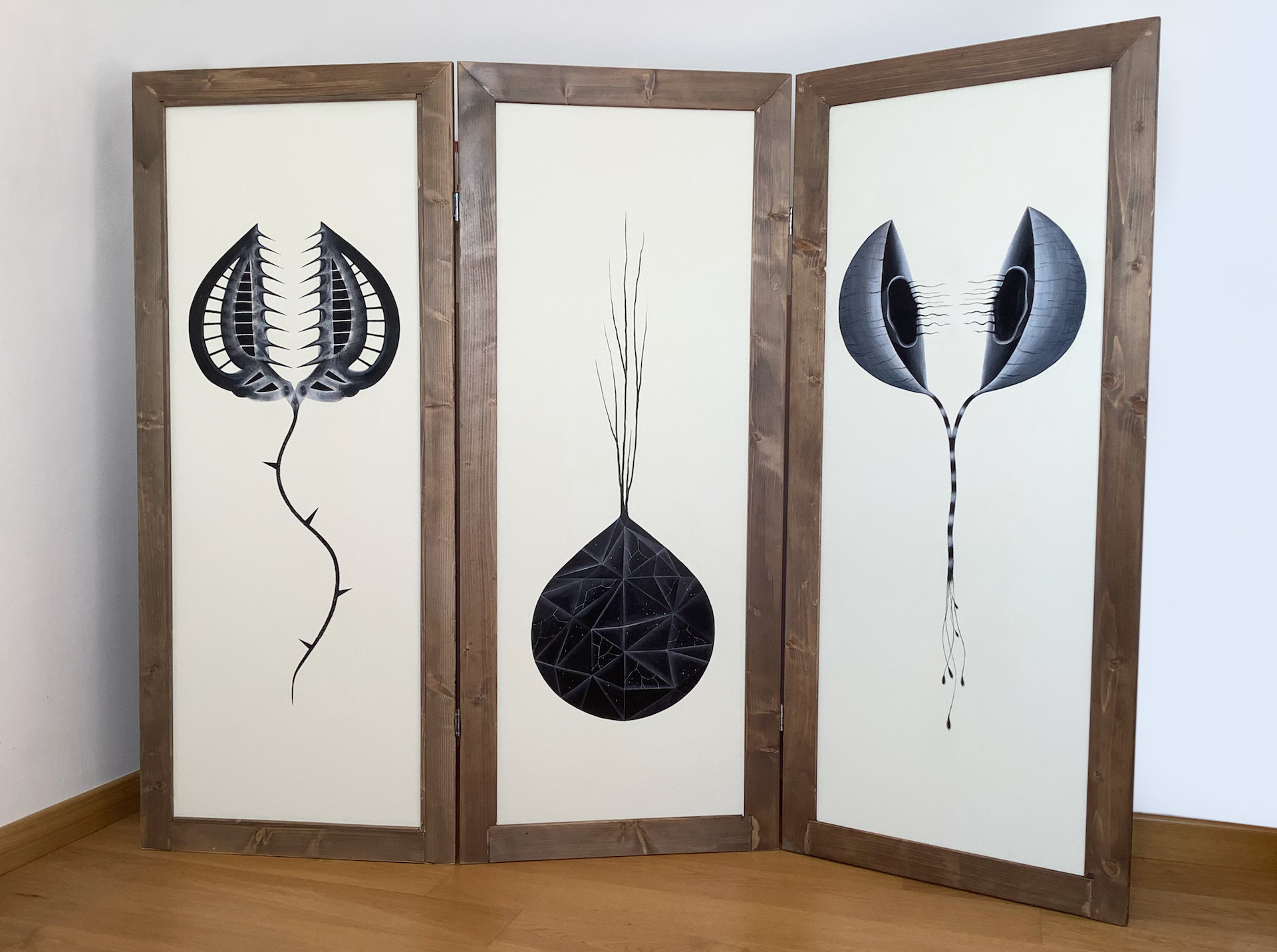 Materiali: Acrilico, grafite, carboncino su MDF Struttura: Paravento a 3 ante fronte-retro